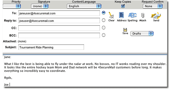4SecureMail comes in six service levels. If you sign up for Personal Plus, for instance, you get two addresses. You can set up your entire family on six accounts, as part of the Personal Family plan. And business plans provide email for up to 100 users. |